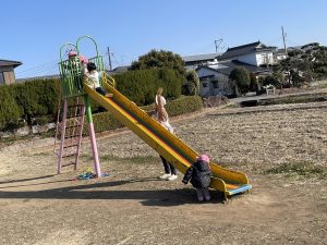 1つは保育者の真似をしてお友達が滑り台をするときにゲートのように手を上げ下げ。友達の顔、先生の顔をみながら楽しそうにしていました。