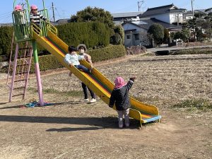 2つ目は、築山を駆け降りる子ども。その先には保育士が待っています。写真は緩やかな坂を下っている様子ですが、少し急な場所も、先生が待っていると、よし!とちょっと怖いけどやってみようと、降りてくる姿もありました。降りてくると抱き留めてくれ、とても嬉しそうな様子。