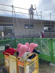 ※写真は外に出る前の散歩車に乗ってる子達。新しい園舎が外から見やすくなってきました。