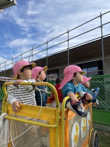 ※写真は外に出る前の散歩車に乗ってる子達。新しい園舎が外から見やすくなってきました。